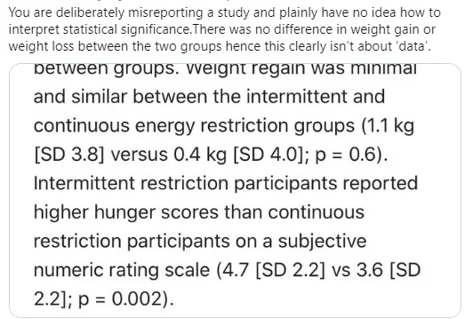 Tutkijoilla oli käytössä kaikki muut luvut, mitkä vaikuttaa noihin ja niiden perusteella ei tilastollisesti merkittävää eroa ollut ryhmillä eli nuo luvut olisi tilastollisesti analysoituna voinut olla täysin päinvastaiset jolloin joku pro-IF agendaa ajava käyttäisi tuota samaa tutkimusta oman sanomansa ylistykseen.Faktat (olennaiset osat boldattu):