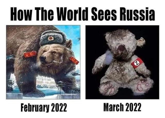 Ryssien olisi kannattanut jättää Ukrainan de-natsifikoinnin yritys ja bioaselabrojen tuhoaminen välistä, niin ei olisi koko maa muuttunut vitsiksi.