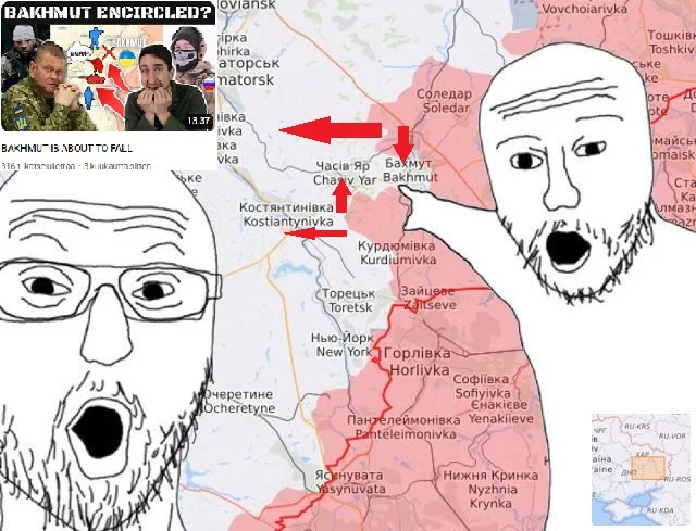 Löysin uuden meemikuvan tälle Bahmut öyhötykselle ja noista pelloilla etenemisestä intoilemiselle. Tähän pitäisi vielä lisätä noita Roopelin paintilla käsin piirrettyjä nuolia ja sen ryssäbotin kuva joka tekee noita "Bahmut falls now" tyylisiä reaktiovideoita jo neljättä kuukautta putkeen.