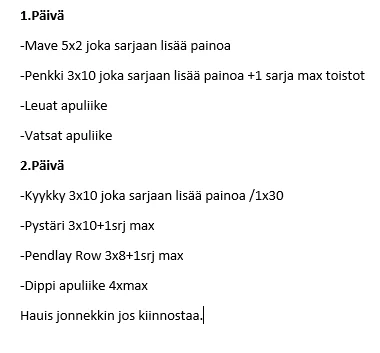 Näin jälkeenpäin todettuna, todella hyvä ohjelma, mutta onko kuitenkin tämän ikäiselle ja tällä taustalla liian lyhyitä sarjoja? Tuliko liian äkkiä liian paljon? Nyt tarkoituksena keventää kahteen kertaan viikossa ja tehdä kymmenen toiston sarjoilla penkkiä, pystypunnerrusta, kyykkyä ja jotain kyynärpäätä säästävää selkäliikettä. Siitä painosta. En ole kuukauteen puntarilla käynyt, mutta silloin oli sama 82 kg kun alussa. Pituutta on tullut sentti lisää, eli jotain on tapahtunut ryhdille.