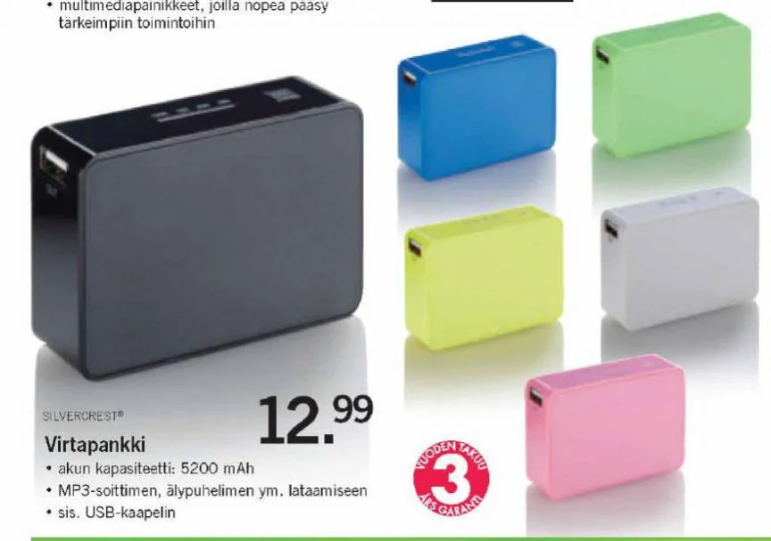 Mulla on tuollainen 2500 mAh ja ehdottomasti suosittelen suoraan 10 000 mAh powerbankia. Saman kokoisia fyysisesti nuo kaikki on ja ei tuo 10 000 mAh maksa kuin vajaan 60 euroa Suomesta ostettuna. Ja siinä nyt ihan oikeasti on sitä jeekua sen verran että ei tarvitse huolehtia koko aikaa että se on täysi ja pystyy lataamaan puhelimet ja tabletit ilman että heti on tyhjä.