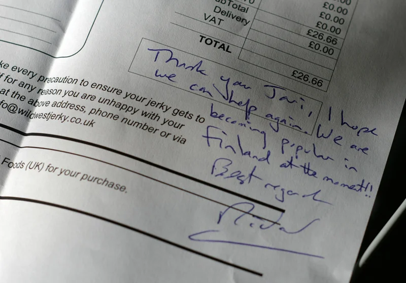 Tulipa kaverin kanssa tilattua tuolta wildwestjerkystä ihan kokeilumielessä. Tavara tuli vajaassa viikossa, ja kuitissa oli kirjoitettuna hauskat terveiset. Liekö tämäkin taas pakkiksen ansiota? :)