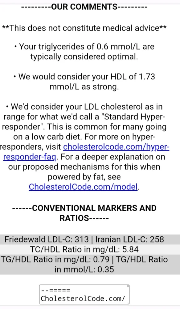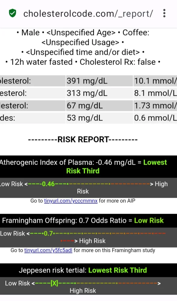 Kokonaiskolesteroli 10.1 mmol/L, HDL 1.73 mmol/L, LDL 8.1 mmol/L, triglyt 0.6 mmol/L. Vielähän nuo menee ihan terveen miehen arvoihin tämän Vesan tulkinnan mukaan.