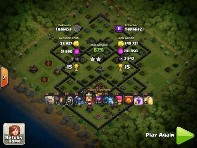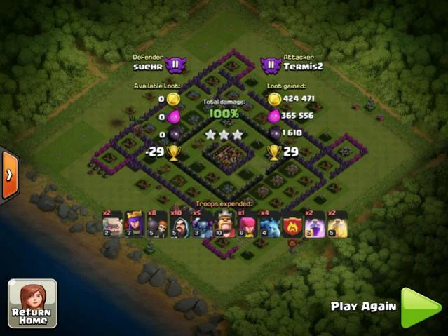 Joukot: 1 Golem, 5 pekkaa, 10 wizardia, 6-8 wall breakeria, 1-3 arsua, 1-3 miniä, herot ja iso Golem CC:ssä.