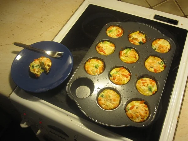 Dusty Hanshaw ketjussa tekivät muffinsivuokassa vihanneksista ja kananmunanvalkuaisesta jotakin "dieettikakkusia" ja sitä päätin kokeilla omalla tapaani. En ole dieetillä, joten valkuaisten kaveriksi vuokiin laitoin hieman (kypsää) lohta sekä wokki-vihanneksia (rainbow pakaste). Muffinsipellin voitelin pienellä määrällä öljyä. Koko setti 12 kakkusta sisälsi (noin määriä):