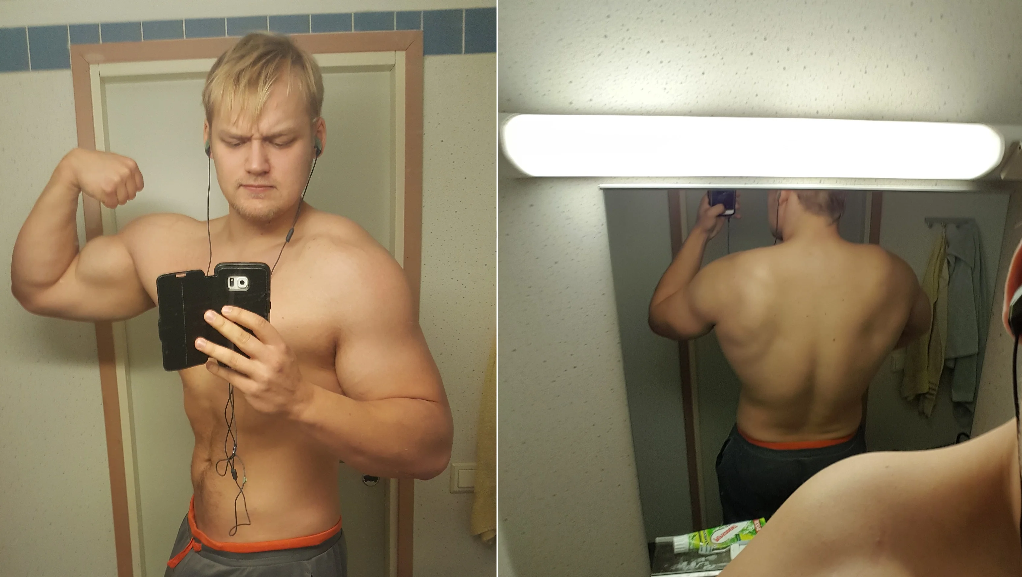 176/80.3kg (colleget jalassa, joten painosta voinee miinustaa joku 0,6kg; tyty sanoi ettei vaikuttaisi muuhun kun painoon, mutta tiedä sitten). Lyödään nyt ihan raakana pöytään vaikka onkin alimpia lukuja mitä täällä on lihasta (miehellä). Ja verrattuna 4kk takaiseen (23.4.2016 vs. 20.8.2016):