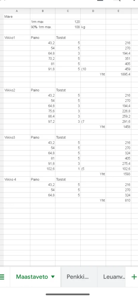 Juuri näin. Tosiaan jos googlaa ” powerliftingtowin wendler” niin löytyy artikkeli, jonka aivan alas asti scrollatessa lopusta löytyy tuo taulukkomuodossa, mitä yritin selittää.