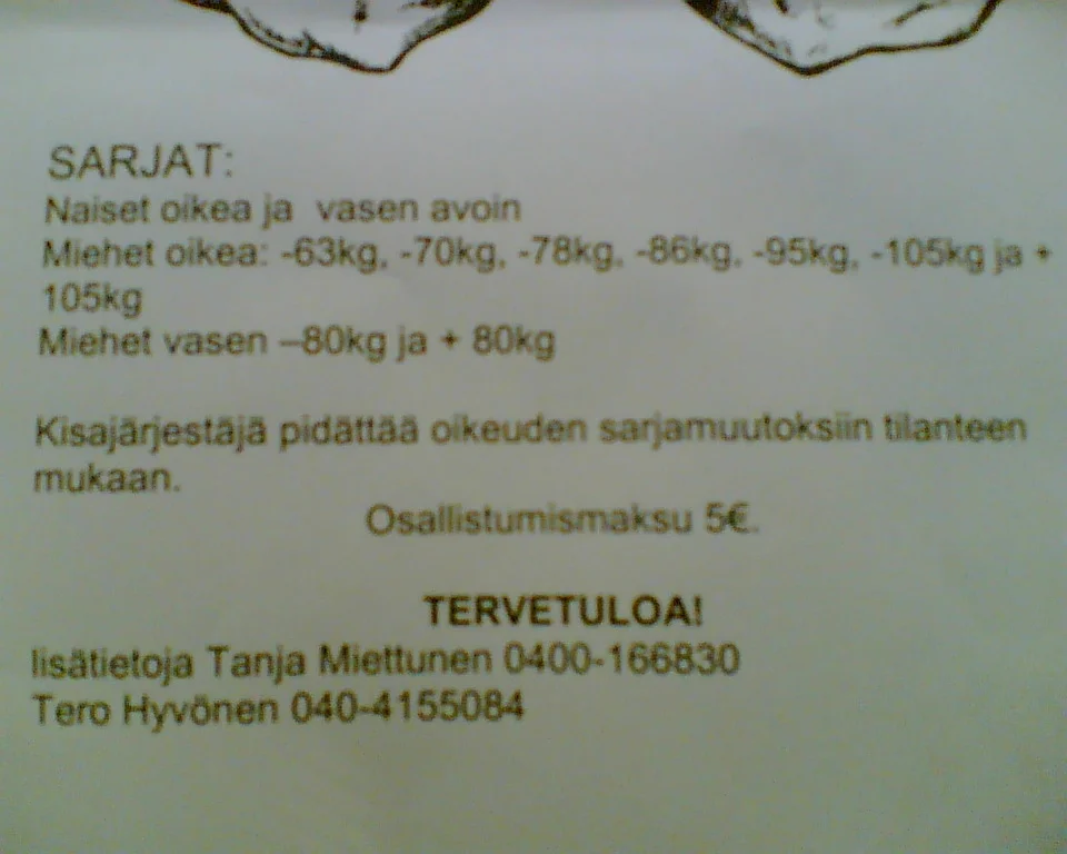 Hehee sama mies.. :hyper: En kai mä mitään tullu voittamaan ,kokeilemaan vaan.. Eipä siinä paljon jakoja ollu ,aivan eri homma ku baarissa kännissä vääntämiset.. Ookkos ite menossa kisaamaan?