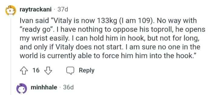 John's strategy to train at the table and let the arm stay as trained and not to do any blood flowing exercise to keep full gains is something I have done forever. Not to warm up before training or competition is something I did forever. Not to get hyped but build the energy to save it for that moment is something that I did forever. But blood flowing thing after training I have done lately with Bison but the movements I do with it is very similar to armwrestling and I just do quickly to make joint work properly before I start getting cold and resting. But in my prime I have never warmed up before the event or training or did any blood flowing after the table training. These are not learnt but felt things. Some people may feel differently about all these and I respect them but looks like I and John felt this way to be better. No one can claim that it didn't work for us. Some may say that I and John had many injuries but who didn't have? Those injuries are the price of the battles we had. There are thousands of people who also have injuries yet don't have much success.