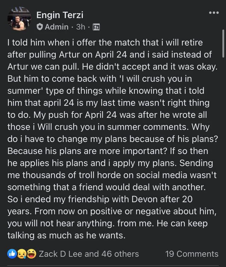 Terzin käytös vaikuttaa kyllä lievästi sanoen erikoiselta aika ajoin... En tiedä olisiko sillä jotain mentaalipuolen ongelmia... Välillä niitä brezenki postauksiakin tulee 300 päivässäIttelle jääny tossa epäselväksi miksi 30 vuoden kädenvääntö uran jälkeen Terzin on pakko lopettaa kilpaileminen juuri huhtikuun 24 päivä