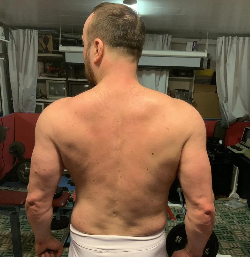 Ensin taustaa. Ikää on 49 vuotta ja selässä paha skolioosi, jota on korjattu 16 vuotiaana jäykistämällä kaikki L1 nikamasta ylöspäin tuonne kaularangan alkuun saakka, eli käytännössä viisi alinta nikamaa liikkuu kaulan lisäksi. Luonnollisesti lantion nikamat ovat vielä vinossa, välilevyt vähän painuneet ja on tässä monesta pullistumasta kärsitty vuosien aikana. Onneksi minulla on kuitenki nuo hermokanavat sen verran isot, että ei ole päässyt syntymään mitään isoja puristuksia. Aikanaan lääkäri totesi, että tää on tämmöstä, nelkyt vuotiaana voi olla että aamuisin joudut kierimään pois sängystä tai tarttet apuvälineitä siinä, kaikki kova liikunta on kiellettyä ja nauti elämästäs nyt. Ja olihan tuo operaatio sen verran karu, pituuttakin tuli 4 cm lisää, että kaksi kuukautta meni, että jaksoi taas kävellä kunnolla sen 2km kouluun ja painoa oli sitten 56kg ja pituutta 181-182cm. Mutta pitänyt ko. lääkärin neuvoja järkevänä vaan aloin kävelemään, sitten juoksemaan, tämän jälkeen pyysin apua kaverin painonnostovalmentajalta, joka myös oli fysioterapeutti ja hän sitten muutaman kuukauden katsoi perääni salilla kuin kaverini treenasi painonnostoa - > käytännössä aloitettiin keskikroppaa vahvistamaan hitaasti mutta varmasti ja sitten oli muuten turvallisia liikkeitä. Minulla oli samaan aikaan 6kk välein selän kunnon tarkitukset ja tällä kertaa ortopedi oli täysin ihmeissään toipumisestani ja totesi, että jatka samaan malliin, liikuntaa vaan, järkeä saa käyttää ja ehkä painin ja judon kaltaiset lajit kannattaa pois sulkea, mutta muuten anna mennä vaan. Loppujen lopuksi päädyin siinä lukioikäisenä ihan tekemään ihan kaikenlaisia punttiliikkeitä paitsi kyykkyä hyvin rajoitetusti, kun se yksinkertaisesti tuntui liian epämiellyttävälle selässä. Maastavedot varsinkin suorinjaloin oli ok, pystyin myös tekemään raakaa rinnallevetoja, työntöä ja hieman raakaa tempaustakin, mutta tuossa vaiheessa varsinkin tuo yläselän jäykistys rajoitti lapojen liikkuvuutta.