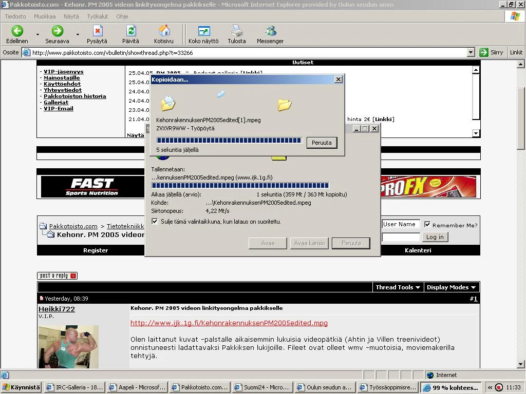 Kyseinen video on nyt samalla ftp -palvelimella, kuin aiemmat Ahtin ja Villen treenivideotkin. Jostakin syystä, kun postitan linkin pakkikselle (ks. yllä), sitä klikkaamalla ei avauduggaan "dialog box" josta näkee, että minkäkokoinen file on tulossa, ja millä vauhdilla.