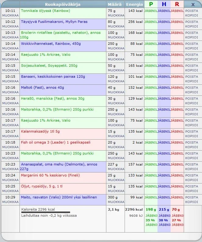 Moro. Hyvä, että tulit järkiis.. Nyt kun vielä rukataan toi laskuri kohdilleen, niin tulee hyvä. Mä löin noi sun safkat tohon laskuriin ja otin erivapauden tehdä vaähän muutoksia. Laitoin Herat ja Maltot normaaliin annoskokoon ja kasvatin vähän tota sun wokkivihannesten osuutta. Noita kapseleita en ihan tajunnu.. Monta sä niitä vedät, että saat irtoomaan 200 kaloria niistä? Jos vedät päivässä muutaman kapselin, niin ei niitä mun näkemyksen mukaan juurikaan tarvii murehtia. Laitoin itse ne tohon taulukkoon vaan siks kun ne siellä alunperin oli. Jos sun dieetti kaatuu kalaöljykapseleihin, niin maailmassa on isomman luokan virhe.