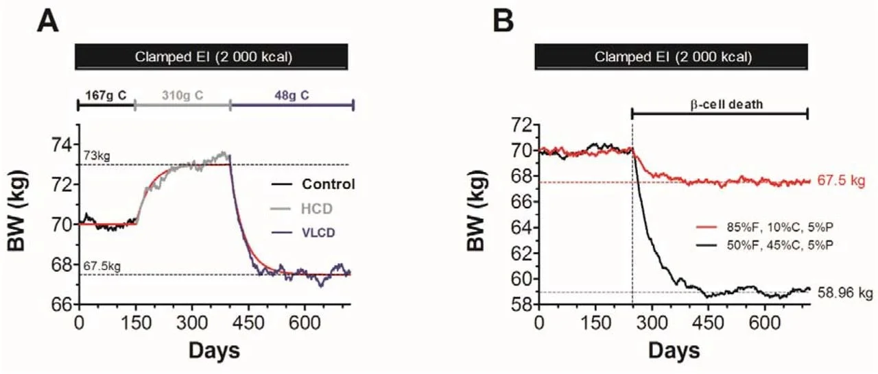 Sen jälkeen henkilö rupeaa noudattamaan Atkins-tyyppistä ruokavaliota eli runsaasti rasvaa, hyvin niukasti hiilihydraatteja ja normaalisti proteiinia mutta energiansaanti pysyy samana: F 75%:a, C 10 %:a ja P 15 %:a. Henkilön paino lähtee selkeään laskuun, sillä tällä kertaa ”Mass In” on vähentynyt, vaikka energiansaanti on pysynyt edelleen samana.