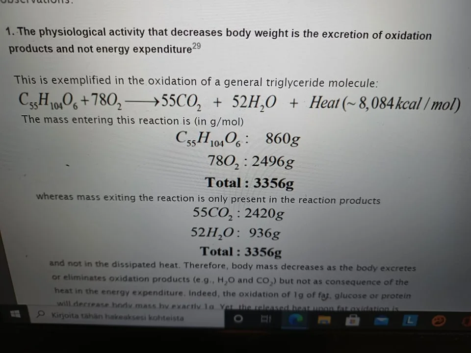 Täten kehonmassa ja rasvamassa vaihtelevat massatasapainon mukaisesti, eivät energiatasapainon mukaisesti. Energia on lämpöä eikä se voi muodostaa massaa.