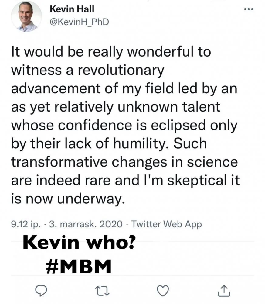 Nämä EBT-heput (Hall, Speakman jne.) ovat jo pitkään tienneet olleensa väärässä. No, annetaan heille rauha etsiä kunniallinen takinkääntömetodi. :) Jos koko ura on pohjautunut virheelliseen paradigmaan niin sen voi suoda näille hepuille.