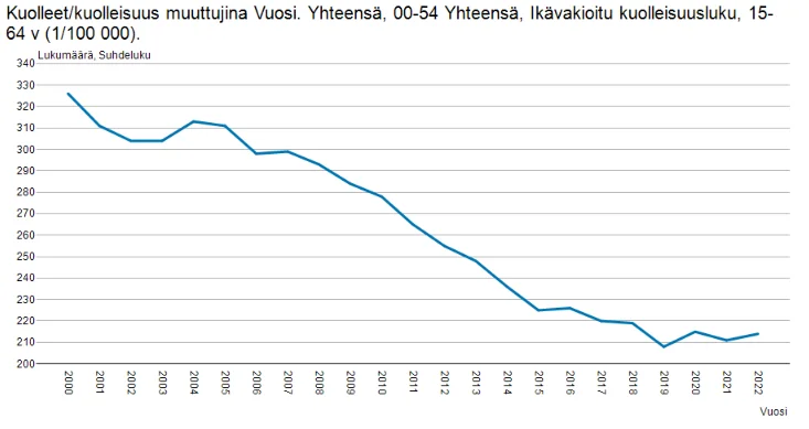 Mulle tuo kertoo, että kuolleisuus on Suomessa 2000-luvulla laskenut - mikä on hyvä asia. Jos katotaan ylikuolleisuutta, eli sitä, paljonko ihmisiä on kuollut ennakoitua enemmän, niin tilanne on eri:Tässä tilastokeskuksesta 15-64-vuotiaiden ikävakioitu kuolleisuus: