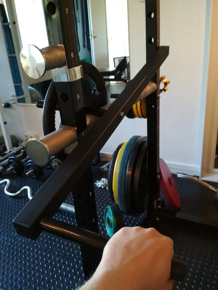 Penkkinä on Heady Dutyn vinopenkki, jonka saa myös alaviistoksi. Tilattuna on myös Heady Dutyn tasapenkki, mutta sen toimitus tökkii pahasti ja menee vissiin vielä kuukausi. Kaks kuukautta oon jo odottanut. Vinopenalle max kuormitus on 250kg ja kun oma elopaino on 105kg niin ei viiti vetää ihan penkin limiiteillä, jos haluaa tehdä jotain penkkiykkösiä tai kyykkyä istumaankäynneillä tms. niin voi käydä kehnosti jos penkki pettää alta. Kyykkyhäkki oli toki siksi ehdoton että saa hyvät turvaraudat kun itekseen treenailee. Ja muutenkin monipuolisuutensa vuoksi otin sen.