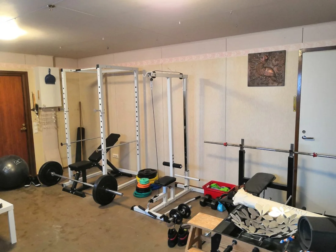 Muutama aika sitten oli juttua täällä tuosta omasta saliprojektista, niin pistetääs tänne kuvaa. Jonkin aikaa tuossa jo tullut veivailtua ja pieniä puutteita huomannut, mutta hyviä ja kokonaisvaltaisia treenejä saa vedettyä. Painoa saa lastattua sen about 180kg, mikä riittää tällä hetkellä vielä mainiosti ja lisää saa helposti lähi-Prismasta, jahka tuolla raudalla saa mavessa sen kuutisen toistoa tikattua. Tänään lähti tilauksen pari isoa Hovet-peiliä Ikeasta, jotka ajattelin kiinnittää tuohon häkin eteen (niistä saa yhteensä sen 3m+180cm peiliä pinta-alaa) ja sitten sitä kumimattoa 10 metrin pätkä, leveys taisi olla 125cm. Sen kanssa täytyy vielä funtsia, todennäköisesti pistän kahtia sen ja jolloin ylettyy melkein koko tuon tilan pituudelta. Kesään mennee sitten seinien ja katon maalaus (musta tai tumman harmaa) colemanit ja arnoldit seinille sitten sen jälkeen tunnelmaa luomaan :puntti: Jotain pikkujuttuja tulee jatkuvasti huomattua ja hankittukin jo, esim. kympistä alaspäin kaksi paria kutakin kiekkoja on ihan kätevä kun kässäreillä veivaa :rolleyes: Tuo Gorilla Sportilta hankittu talja on ihan OK hinta-laatusuhteeltaan, mutta ei sillä toki mitään selän raskaita vetoja tehdä. Lähinnä hannujen veivailu, plus selän ja olkapäiden hapottelu, pulloverit jne. tulevat tuolla kyseeseen.