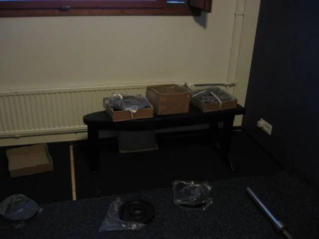 Noniin. Ekat kuvat ovat ns. ykkösvaiheesta, kun paikalla olivat kumimatot, penkki, Texas Power Bar, jousilukkoja ja vähän päälle puolet lätkistä. Kolmanteen kuvaan sattui maskottikin, 15-v Muusa narttu. :D