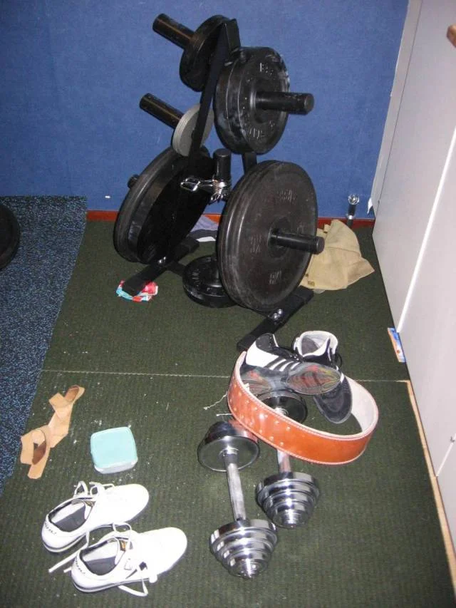 Lätkät, kumimatot, Texas Power Bar, penkki ja häkki Selkäinahon Saken kaupasta. Häkki on olevinaan käytetty, mutta uudelleenmaalattu. Ite en erota sitä uudesta. Sen ainoa vika on 200cm korkeus, korkeampi malli olisi parempi. Muutenhan toi on toiseksi paras, mitä rahalla saa, kestää vaikka puoli tonnia ja jalat leviävät siten, että saa lätkiä ankkuroimaan kätevästi. Lattiaan pulttaaminen ei tullut kyseeseen, eikä huonekorkeus antanut myöten vaneriselle nostoalustalle, joten harjoittelu.netin myymä halpa, mutta riittävän hyvä (tsekkasin senkin ihan omin silmin) ei tullut kyseeseen. Penkki on kanssa älyttömän hyvä. Se on pitemmällekin nostajalle riittävän pitkä, sopivan levyinen, korkuinen ja kova, eli just eikä melkein täydellinen mun makuun. Penkkihän ei saa olla pehmeä ja kapea, vaan päinvastoin.