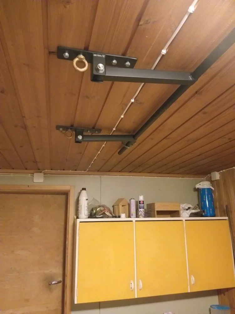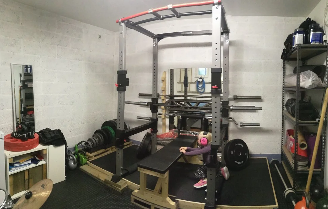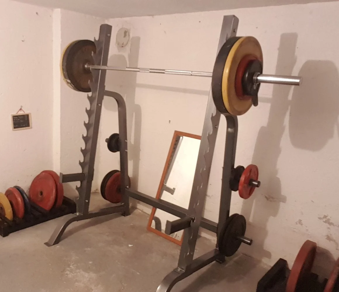 Mulla menee tilaa karkeasti 5 m2 kaikkeen mitä kotisaliin liittyy. Samaan 12 m2 tilaan uppoavat myös lasten rummut, arkkupakastin ja vaimon crosstrainer joka toimii oivana ripustimena rannesiteille, vyölle, remmeille yms. Rahaa uponnut varmaan 1500€ about. Räkkinä toimisi paremmin open rack tyyppinen missä takapuolen pystyputket olisivat lyhkäsemmät niin ei tarvitsisi venkslata tankoja räkin ja seinän välistä niin kovasti. Mutta näillä on 3 vuotta pärjätty.
