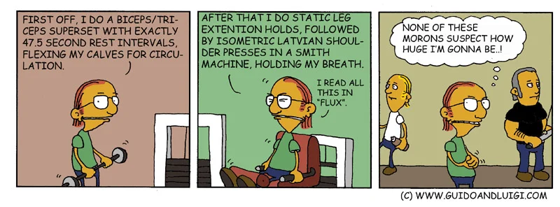 Asioista tykätään vaan tehdä ihan helvetin vaikeita nykyään. Salilla ehkä alle 5% treenaajista sisäistää tämän, ja loput sitten "tuhoaa lihasta joka suunnasta", ja sen huomaa myös ulkonäöstä. Ja tämä siis taas kun puhutaan sellaisista yksilöistä jotka eivät kilpaile edes fysiikkalajeissa, saati halua, mutta haluaisivat silti olla tietenkin isoja ja vahvoja.