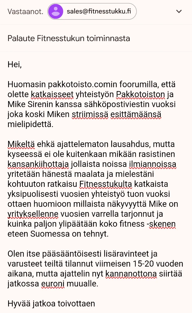Ps. Fitnesstukulle laitoin itse ainakin mailia kuinka typerää heidän reaktio tähän toimintaan oli ja jää pulverit sieltä tilaamatta