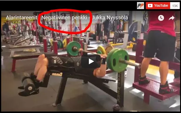 alavinopenkki. rintabodailuun oikein hyvä ja korotusta paria paksua levyä enempää tarvi. käytän apuliikkeenä penkkaajille myös. negalla tarkoitetaan yleensä sitä laskuvaihetta ite liikkeessä.