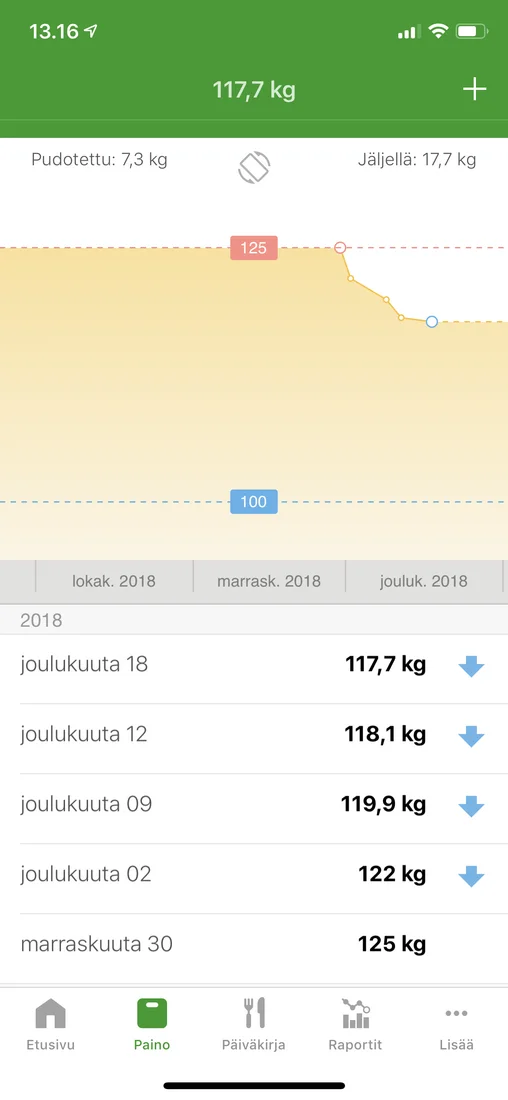 Latasin Yazio kalorilaskuri sovelluksen. Tämä on maksullinen jos haluaa yhdistää aktiivisuusrannekkeen siihen.