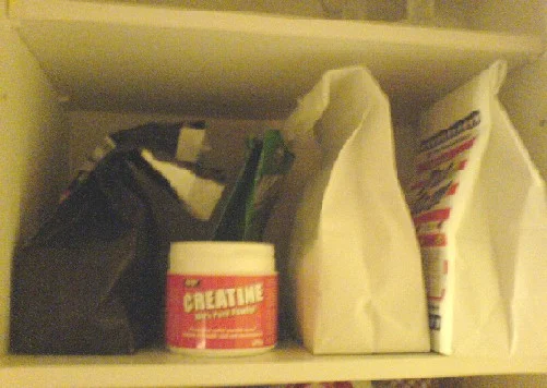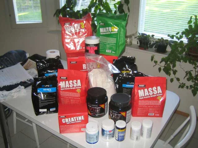 kuvia ei oo mutta 5 ämpärii mass blastia näyttäis olevan, osa tosin vähän vajaita, fastin 900gr kreatiinipaketti, muutama hera100 ämpäri ja parit maltopussukat. Noilla mennään. :)
