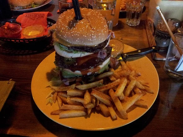Tuli vedettyä selkäreenin päälle 2 isoa hodaria, kourallinen ranskalaisia ja jälkkäriksi 5 isoa keksiä. Jos sitä illalla vielä jotain pientä, esim. jäätelöä ja metukkapatonkia.