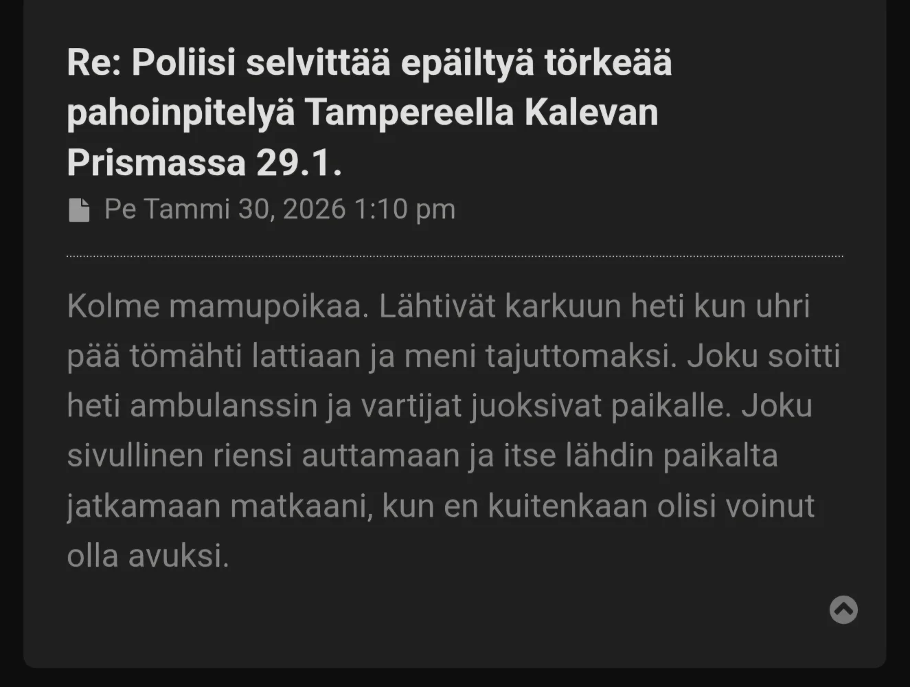Useampi alle 20v hakkasi 40v miehen prismassa. Kuulostaa jotenkin tietyn kulttuurin omaiselta käytökseltä. Nyt on näkynyt netissä paljon videoita missä mamut häiriköi kantasuomalaisia kaupoissa.