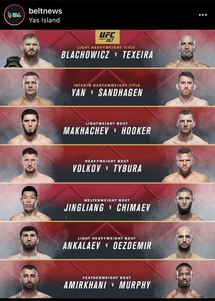 Ei Makwanin ottelu ollut missään vaiheessa UFC 267 main cardilla, kaikki kunnioitus Makulle ja Leronelle mutta ei nimiarvo ole tällä hetkellä lähelläkään sitä että olisi tuolla mukana. Kuusi ottelua on jo muutenkin tavallista enemmän pääkortille. Kyllä paikka numerokortin alaotteluissakin on ihan hyvä slotti vielä.