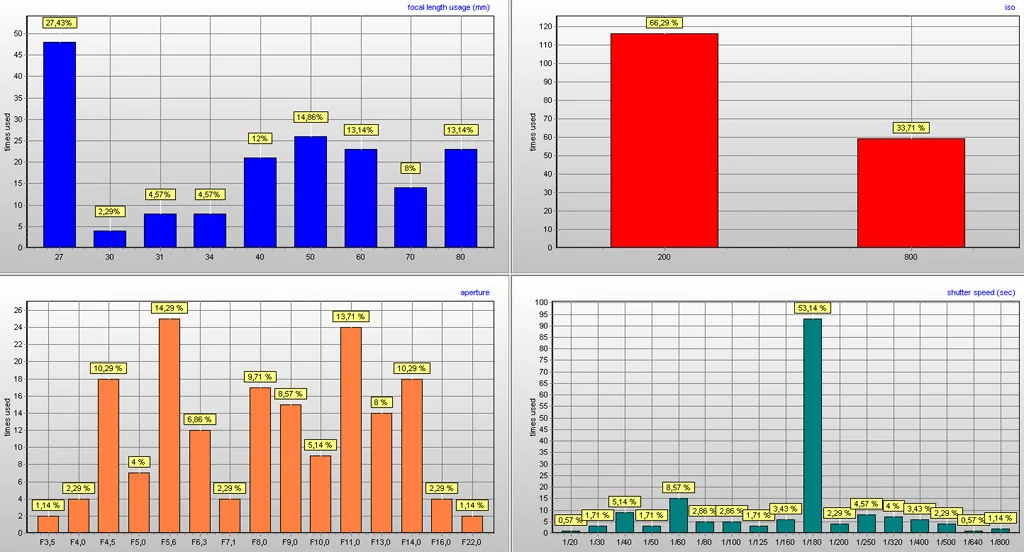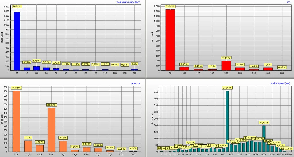 Itse kuvaan arviolta 80% kuvistani 28-35mm välillä, tarvetta olisi saada lisää laajakulmaa monesti muttei ole lasia vielä. 35-300mm väliä tulee käytettyä ehkä 20% kuvista niin että mitä lähempänä laajakulmapäätä ollaan sitä yleisempää käyttö ja päinvastoin. Tota 300mm käytän jo tosi harvoin.