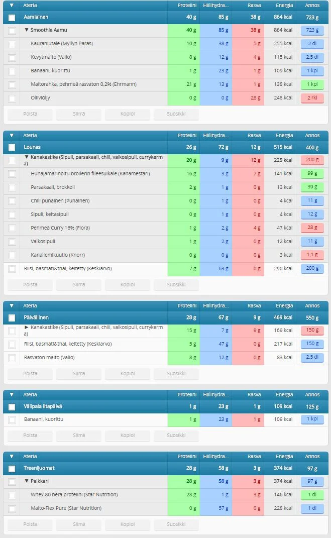 Tässä tyypilliset treenipäivän ruokailut: