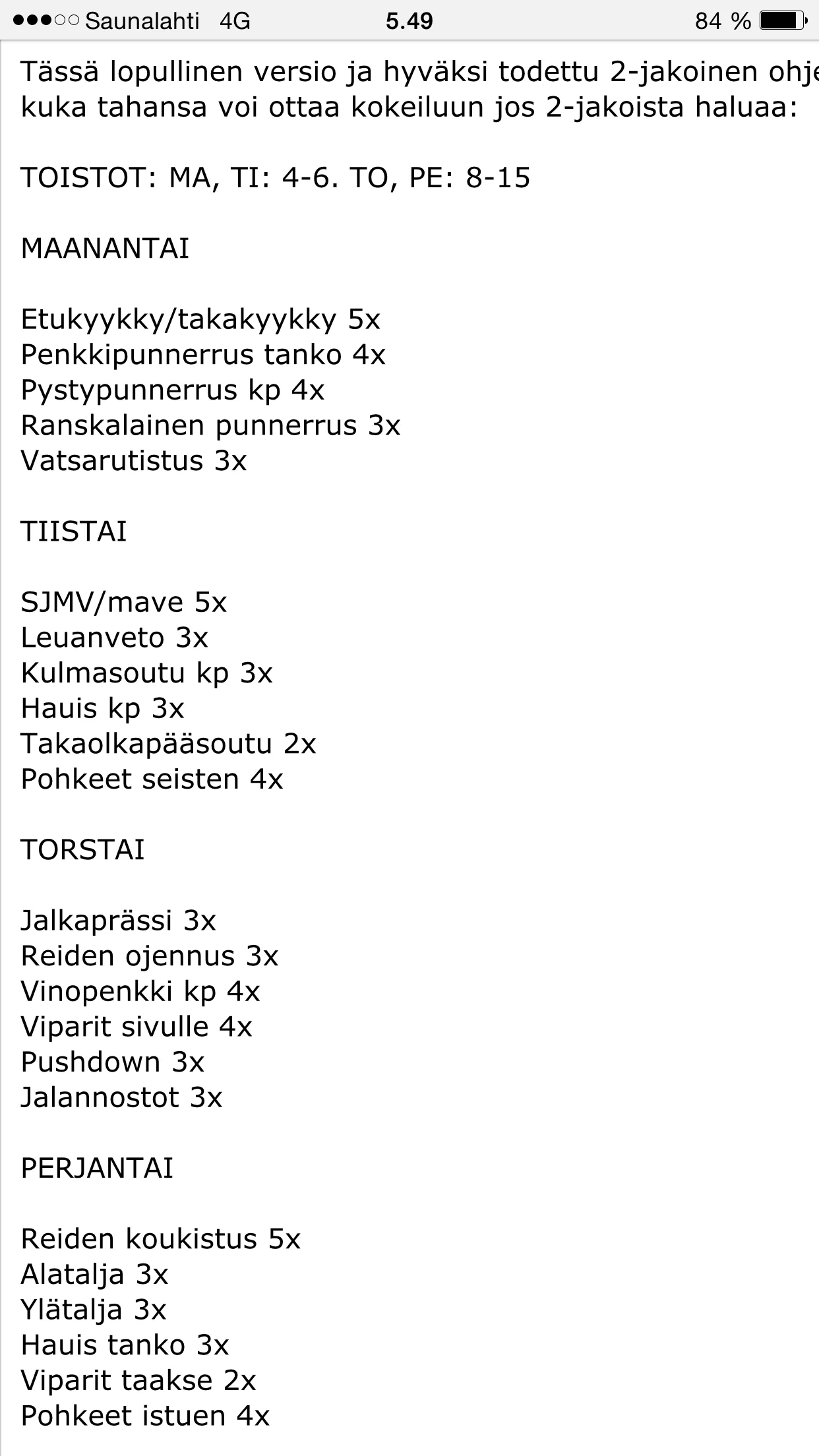 2-jakoisella, tavoitteena saada voimaa lisää, varsinkin taka-kyykkyyn ja penkkipunnerrukseen. Kyllähän sitä voimaa tuntuukin tulevan kun kalorit on plussan puolella...