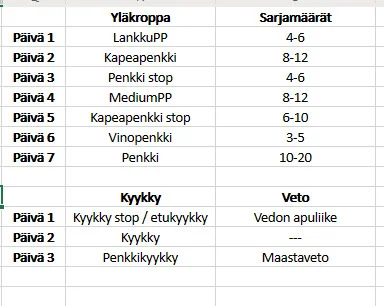 Noi joka kerta, lisäksi mitä ikinä huvittaakaan, pääasiassa leukoja. Treenit aina kun huvittaa, joskus neljä päivää putkeen ja pari päivää off, joskus joka toinen päivä. Ihan tappiin en vedä koskaan vaikka liian tiukkoja sarjoja otankin koska olen tyhmä, pikkuhiljaa sekä volyymia että painoja ylöspäin. Vatsaa pitäisi treenata enemmän mutta en tee sitä koska en tykkää.