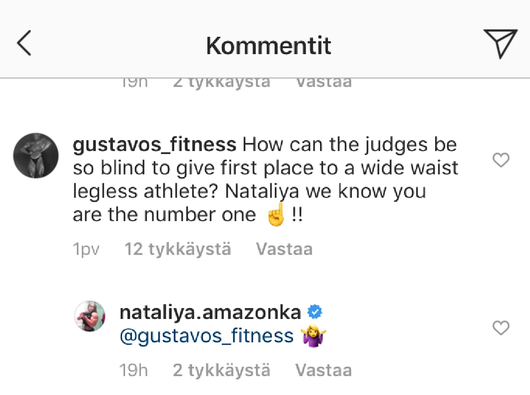 Tuolla on ihan jäätävä määrä kommentteja tuomaroinneista. Samat sokeat apinat istuneet siellä kuin kemppaisenkin kisassa. Ihan päätöntä tuomarointia. Natalia sanoo tuossa yhdessä kommentissa että saa nähdä tuleeko seuraavaa kisaa koska hän tuhlaa aikaa, rahaa ja terveyttä. Koska tuomarit vetää homman ihan läskiksi. Syystäkin turhautuu.Aika pelleilyä tuo kyllä jo. Natalia aivan ylivoimainen ainakin omaan silmään. Siellä kyllä tuomarointi ollut aika erikoista, mutta semmosta se vissiin sitten välillä on.