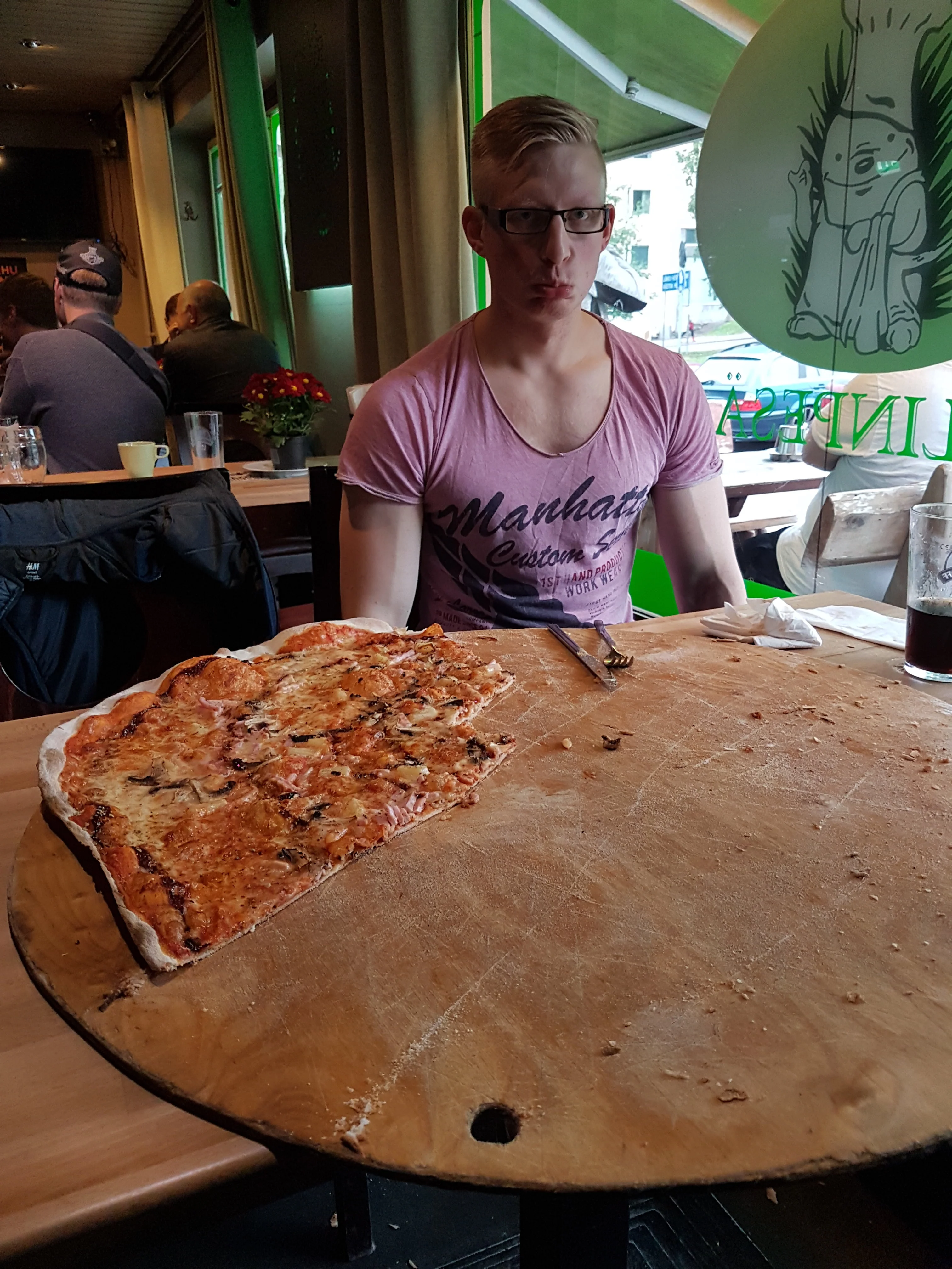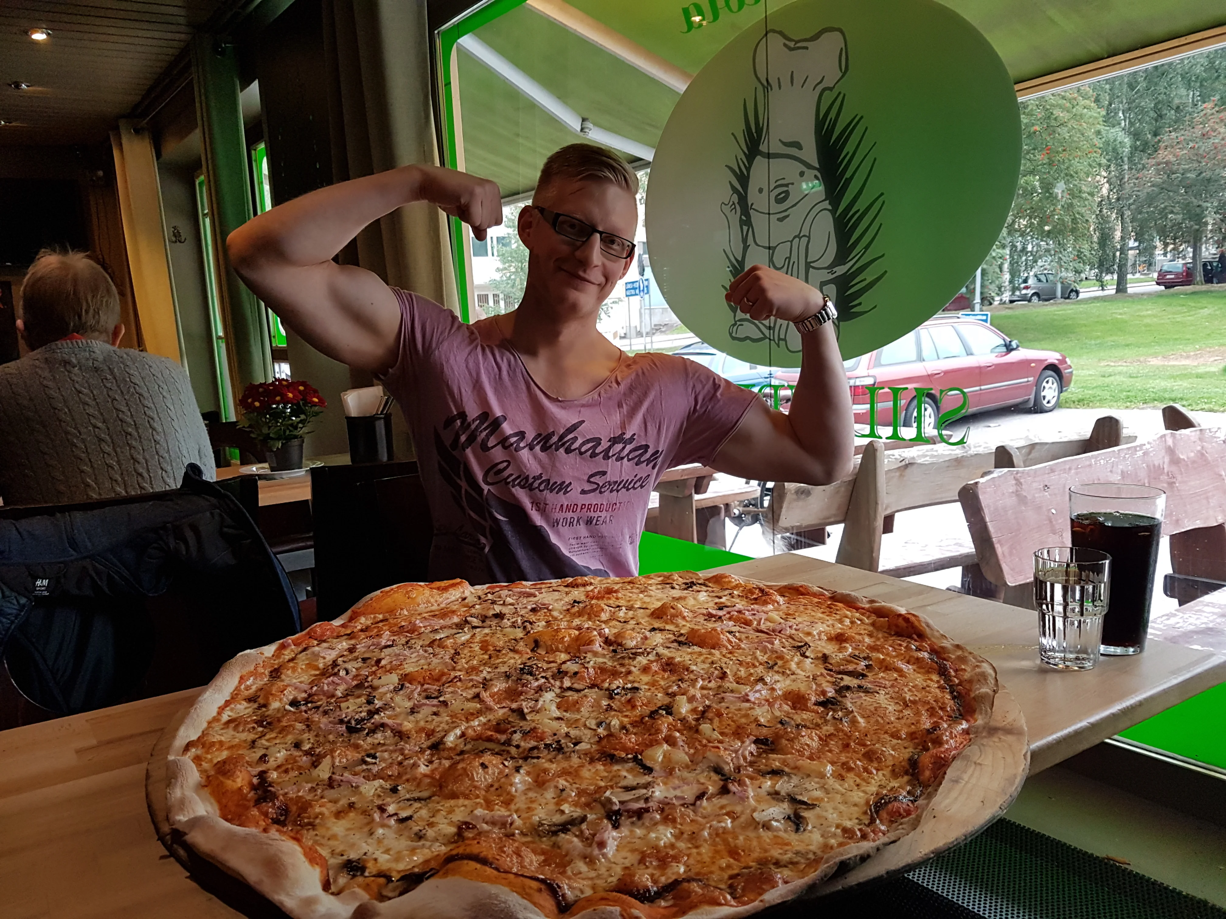 Juu elokuussa söin, aika tosin jäi huonoksi 44min x sekunttia. Tuli ylimielisenä yritettyä alle 20min syödä ja vettä meni sen mukaan. 20 min kohdalla oli noin 1-1.5/8 jäljellä ja kapasiteetti lähes täynnä pizzasta ja vedesä, mutta sain kuitenkin lopulta syötyä. Joka tapauksessa ihan hwlvetin kova suoritus minusta mikäli ton onnistuu syömään. Ensi vuonna käyn kyllä uudestaan syömässä paremmalla ajalla.