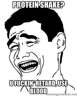 Eli Pyrinnöllä oli tänään joku semikynis heebo tekemässä kyykkyä. Olin siinä itse vieressä hinkkaamassa penkkiä ja seurailin siinä välissä. Sitten jäbä kaivoi repusta sheikkerin, jossa oli jotain ihan veren näköistä tavaraa. Siristin silmiäni vähän aikaa, ja ei helvetti, jäbähän alkaa juomaan sitä :D Siinä sitten puolet oli kuitenkin rinnuksilla, ja jäbä tulee nauramaan viereen "heh, heh, no nyt on paitakin veressä ja verenmaku suussa :D" Ei helvetti :D