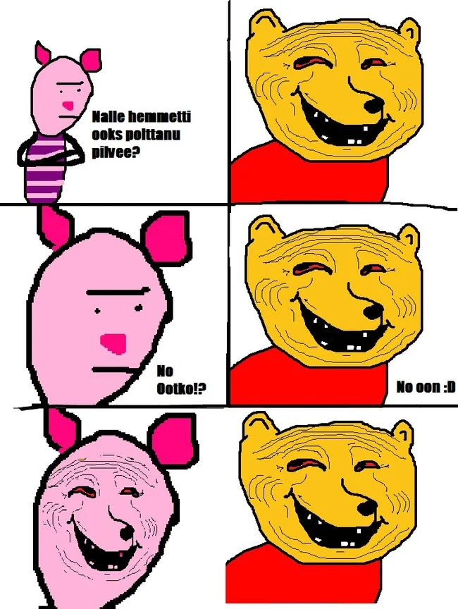 Eiköhän tota nekrua ole kateltu jo tarpeeks. 5 sivua peräkkäin samaa meemiä ni ei se nyt enää naurata.