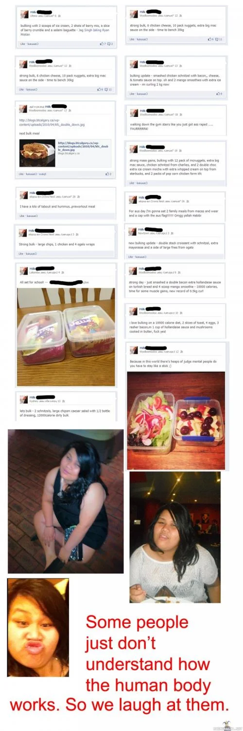 Näyttäis käyvän salillakin ja luulee ilmeisesti tulevansa vahvaksi vetämällä kamalat määrät kaikkea ihan hirveetä paskaa. Kamala läski bulkilla on muutenkin aika ironista.Sorry en tajua yhtään tota viimeisintä, joku akka syö roskaruokaa tuelta raporotoi siitä duckfacen kera, mutta mikä on pointti?