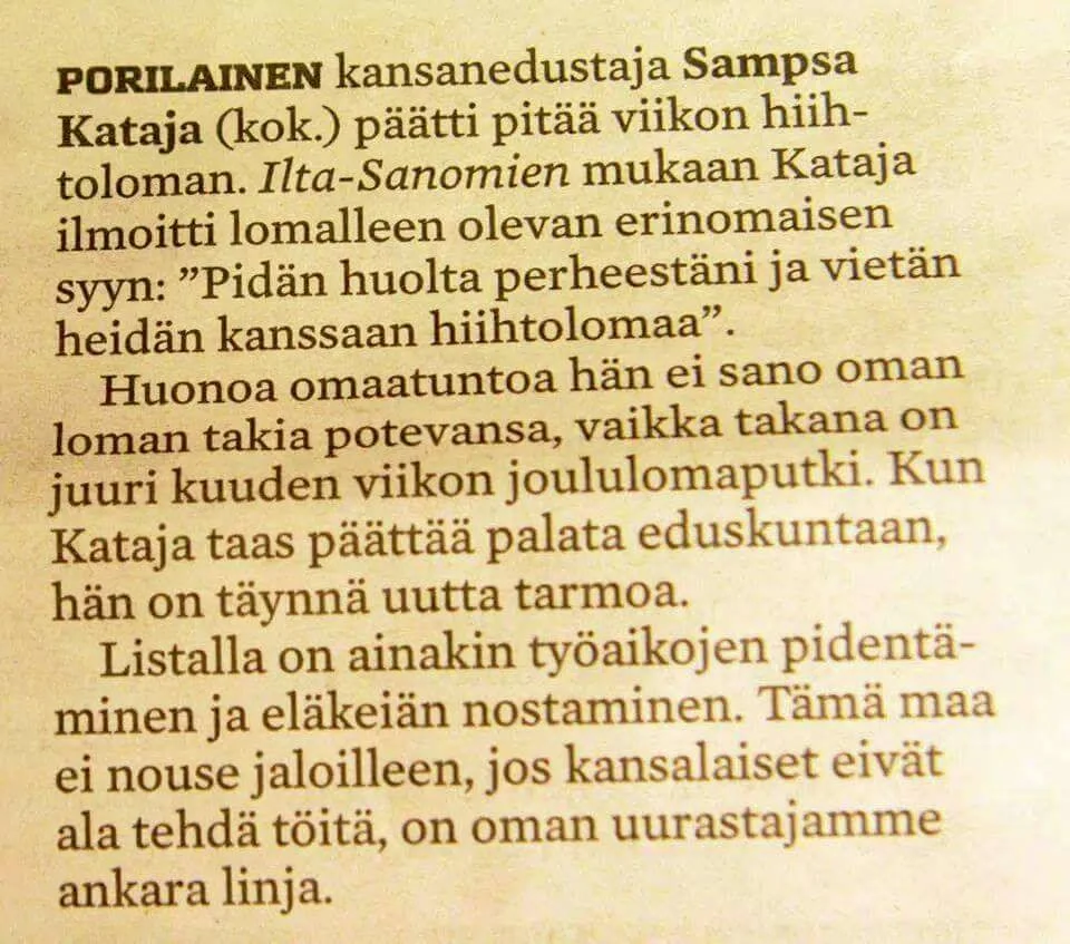 Juuri näin! Kataja on hieno mies ja äärimmäisen rehellinen poliitikko, joita on harvassa. Ei ole mikään lipevä mielistelijä. Jos ei tunne huonoa omaatuntuo lomasta niin ei sitten tunne. Ei sitä selitellä tarvi.