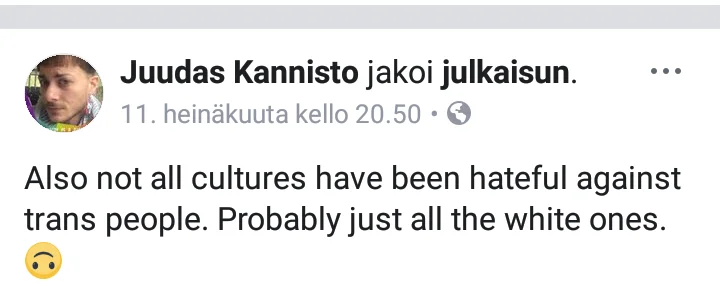 Ois super mielenkiintosta tietää, että jos kyseinen henkilö näkisi yllä olevan postauksen, näkisikö hän kritiikin transvihamielisenä asiana vaiko kritiikkinä hänen mielipidettään kohtaan? :D