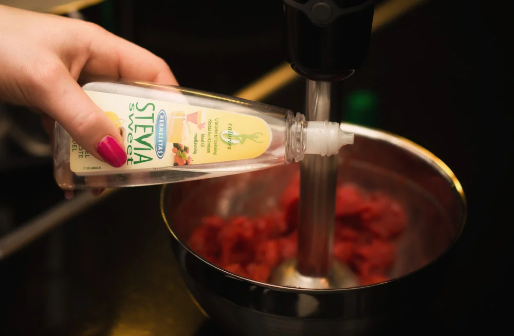Soseuta mansikat sauvasekoittimella hilloksi ja makeuta makusi mukaan makeutusnesteellä.