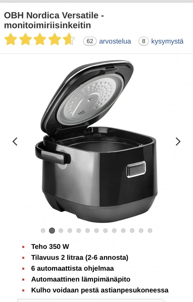 Mulla on YumAsian Bamboo-riisikeitin, jonka hommasin ennen Brexitiä. Ollut kyllä todella tyytyväinen, vaikka yhden päivän riisien keittelyyn onkin hiukan ylimitoitettu. Hintavahan tuo on, varsinkin nykyään, mutta tuolloin Suomesta ei vastaavia saanut. Tuo OBH:n laite voisi kyllä olla hyvä ostos jos ei välttämättä huippulaitetta tarvitse. Edit. Päädyin tuohon Bamboon koska induktio ja GABA-moodi tummalle riisille.