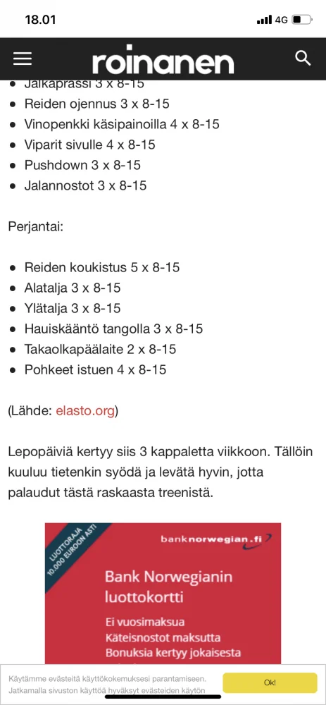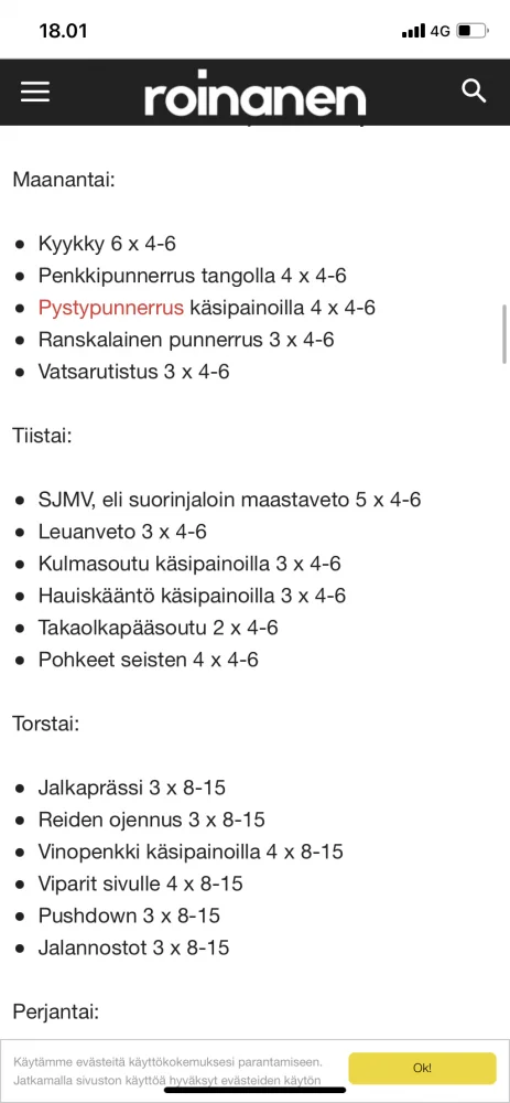 4-6 siis koko treenin aikana, eli 1-2 per lihasryhmä.Meinaatko että 4-6 liikettä per lihas? Vois tulla pitkä treeni