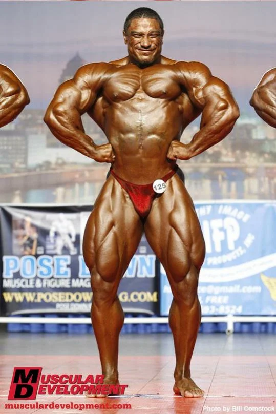 Oothan sä Jussi ihan oikeassa tuossa että pohkeet on ihan hyvän kokoiset, mut lausetta voisi jatkaa sillä, et hyvät sellaiselle 10-15kg heppoisammalle kaverille. Alla olevassa 2009 Amateur Olympian kuvassa Roellyn fysiikka näyttää varsin tasapainoiselta, mut näistä ajoista massaa on kertynyt varsin runsaasti yläkroppaan & reisiin ja pohkeet puolestaan ovat säilyneet ennallaan. Voiko pohkeita sitten saada kasvamaan samassa suhteessa muiden lihasryhmien kanssa, on eri asia, mut kokonaisfysiikkaa ja mittasuhteitahan tässä katsotaan muiden kriteerien ohella. Pohkeet ovat jääneet jälkeen, se on selvää, ja levinneen keskivartalon kontrollointi on ollut viime kisoissa silmiinpistävän heikkoa...