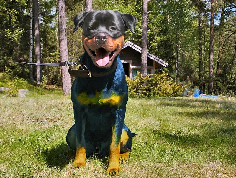 Valitettavasti photaria ei ole käytettävissä tällä hetkellä, mutta paintilla väänsin. Ei siitä sitä remmiä enää näe kuitenkaan ja koiramaisuus säilyi hyvin IMO.